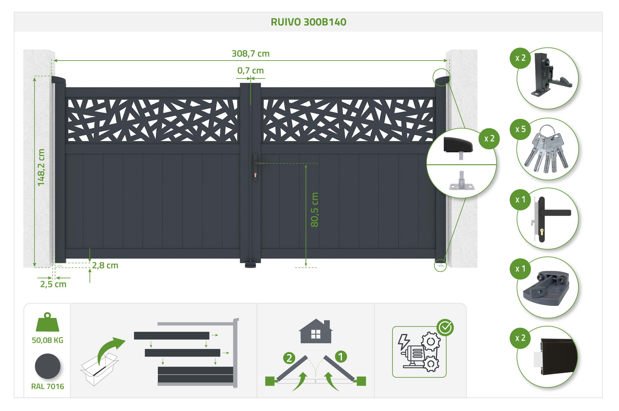 All the accessories necessary for the installation of your portal are provided to you, and everything that is included in our portals is specified in the technical characteristics of the product as well as in the description.